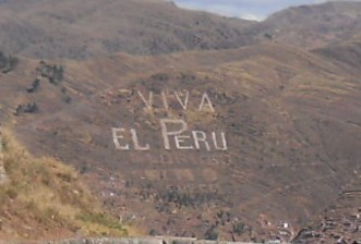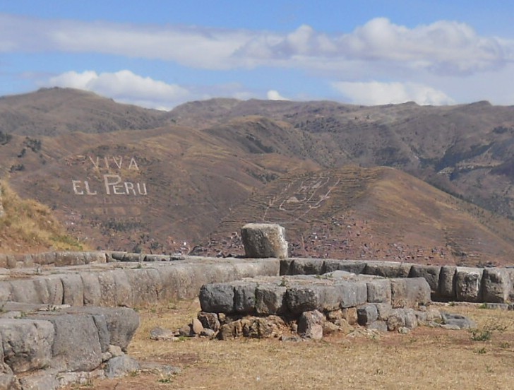 Sacsayhuamán (Cusco), quinto piso, fundamento 06 - vista a diseños en cerros, "Viva el Perú"