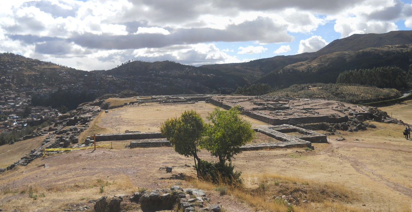 Sacsayhuamán (Cusco), quinto piso, vista del árbol por abajo, panorama