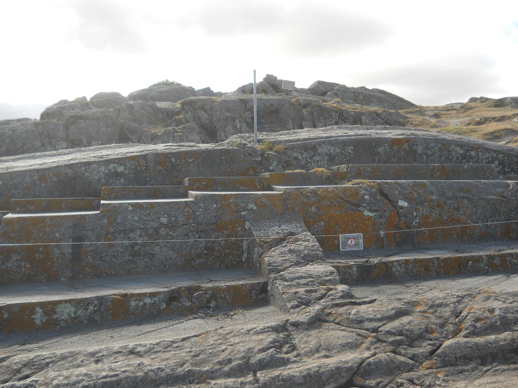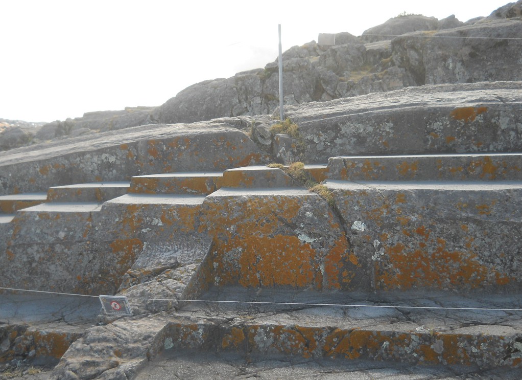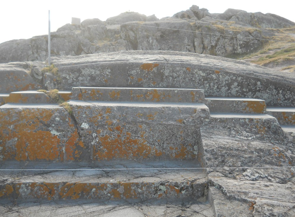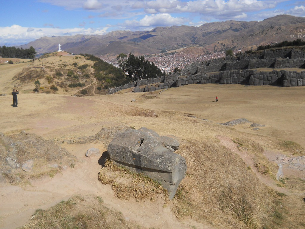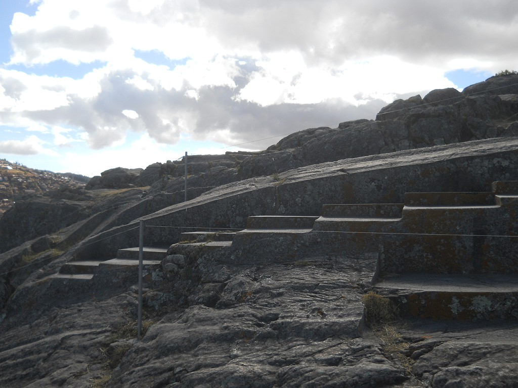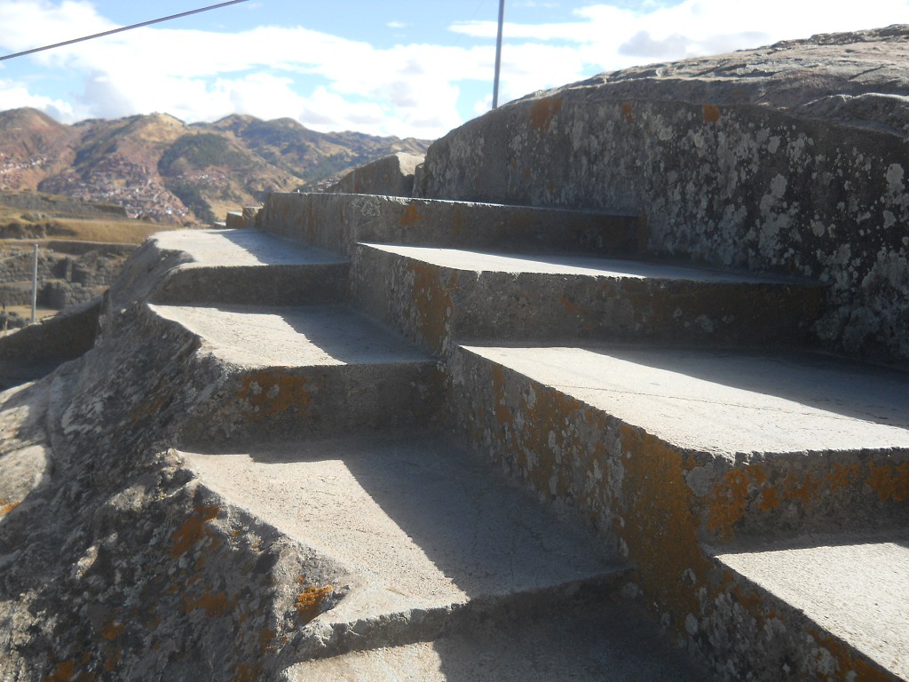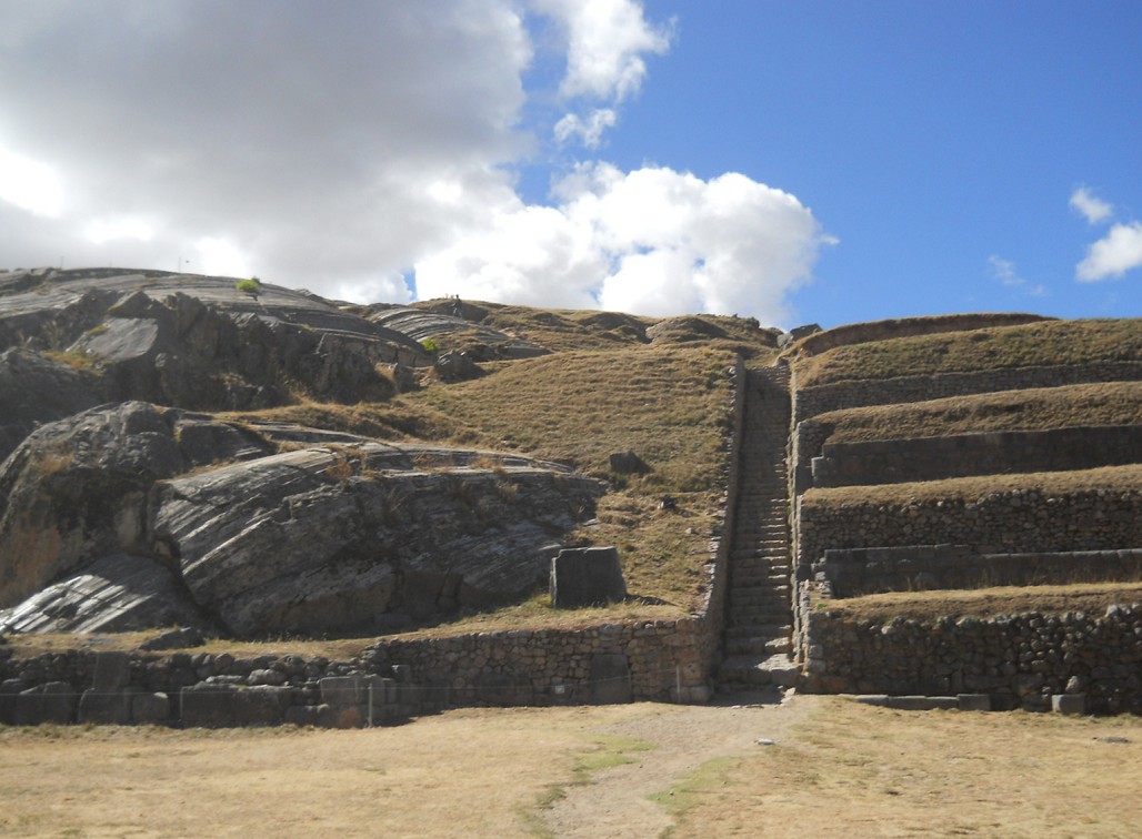 Haber subido la escalera a la colina aplanada de Sacsayhuamán se ve piedras de los incas de un fragmento de un muro, piedras gigantes, una escalera cortada esculturada en un pedazo y un trono pequeño.