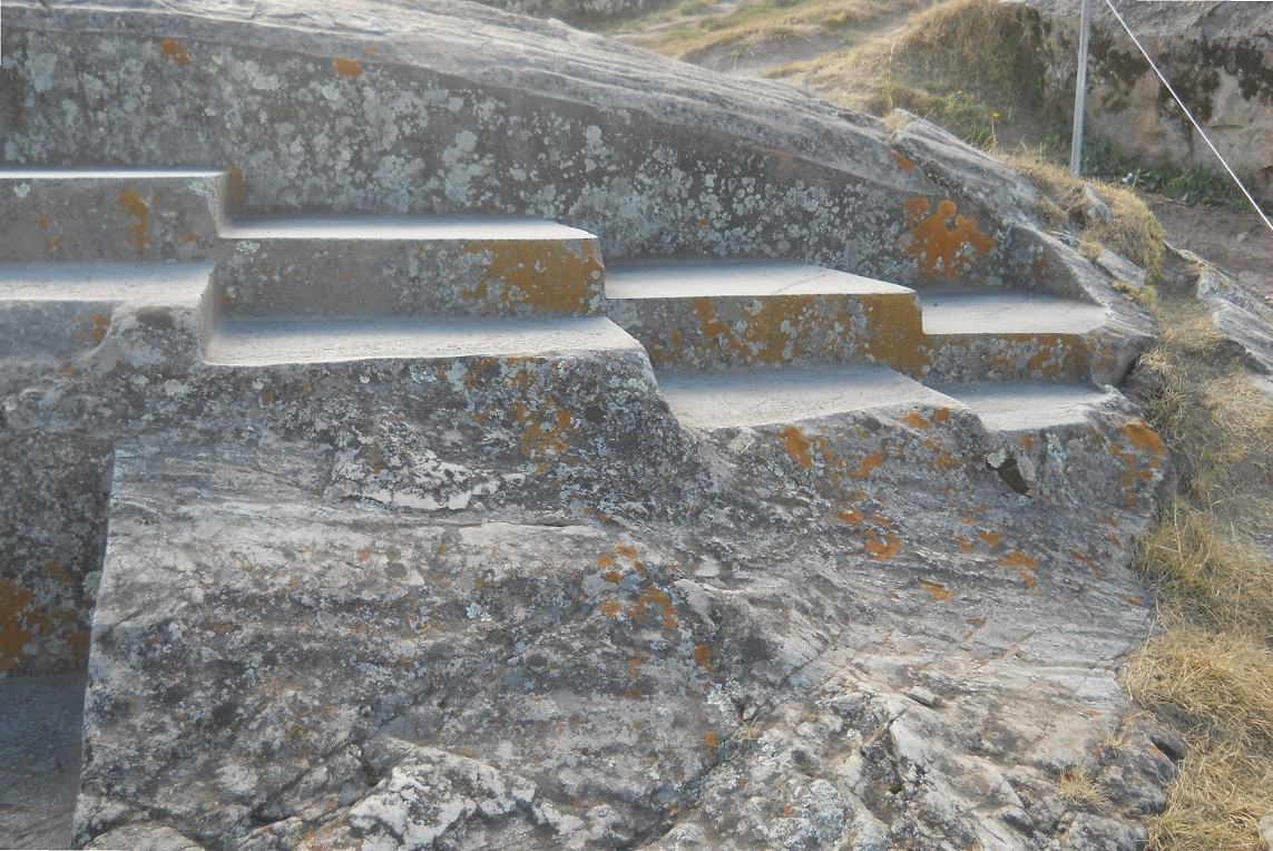 Sacsayhuamán (Cusco), en la colina aplanada, escalera cortada esculturada en un pedazo 1+2 - y hay un trono esculturado