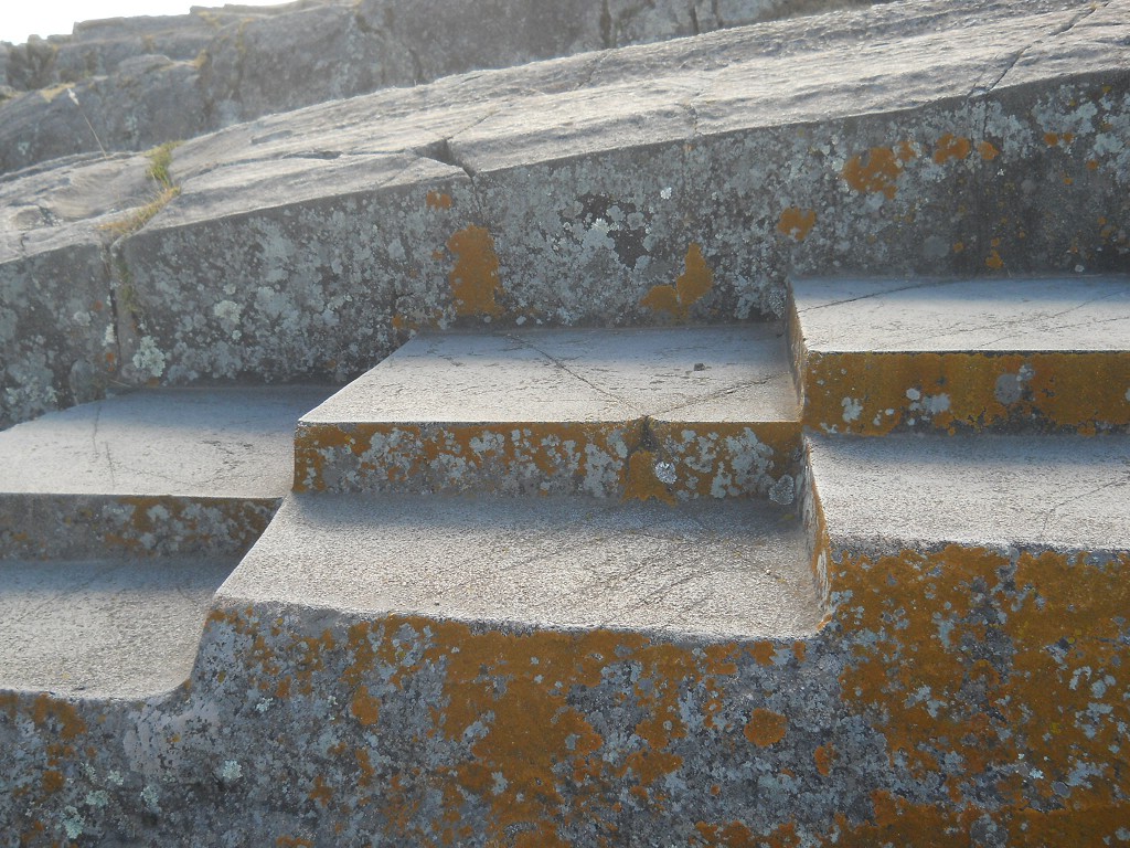 Al lado de la escalera se ve las partes aplanadas de la colina:
