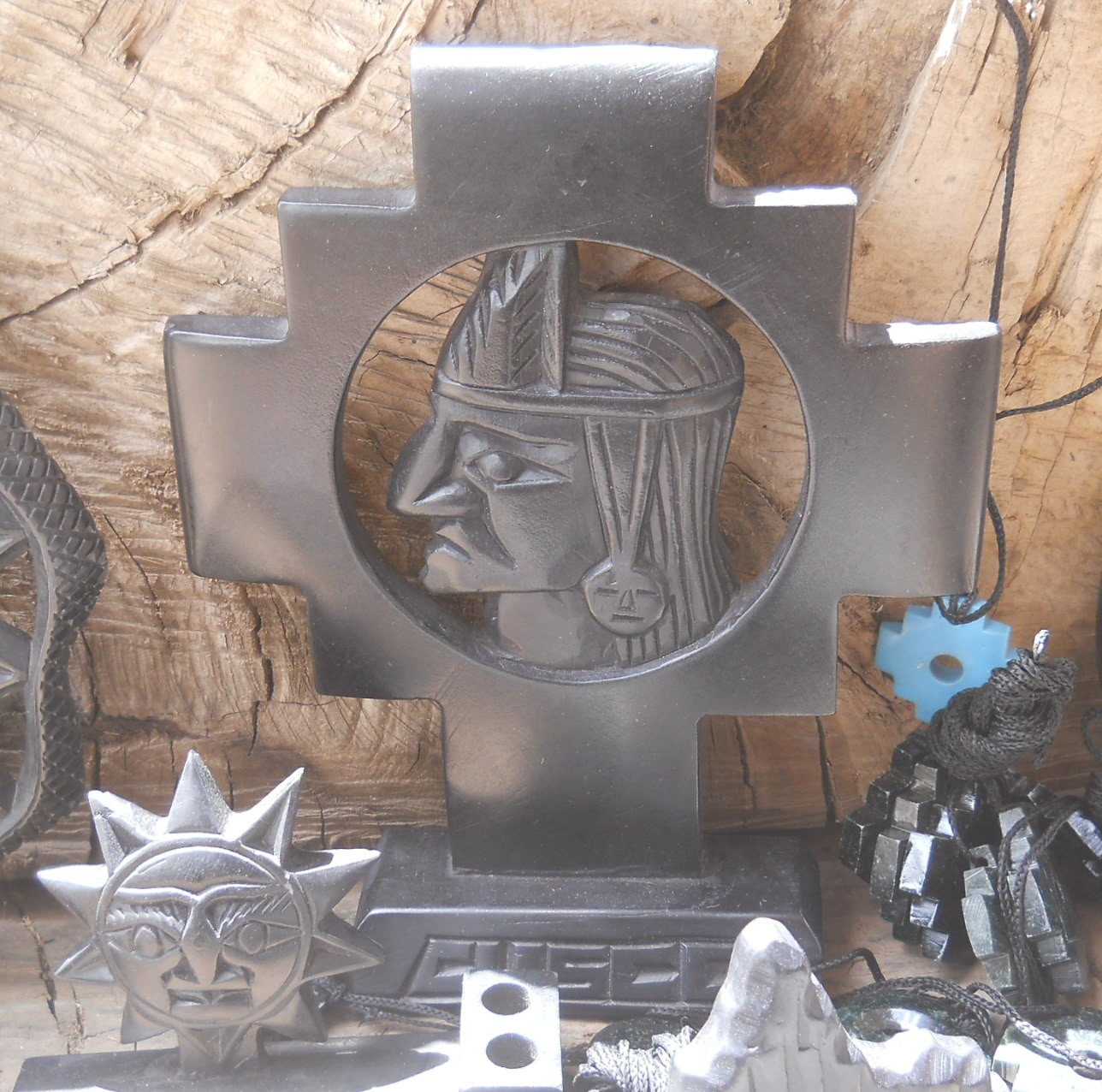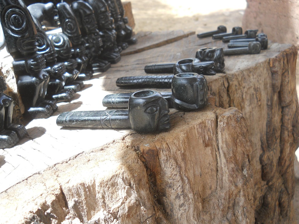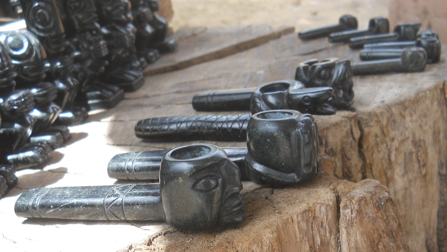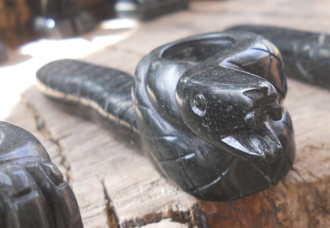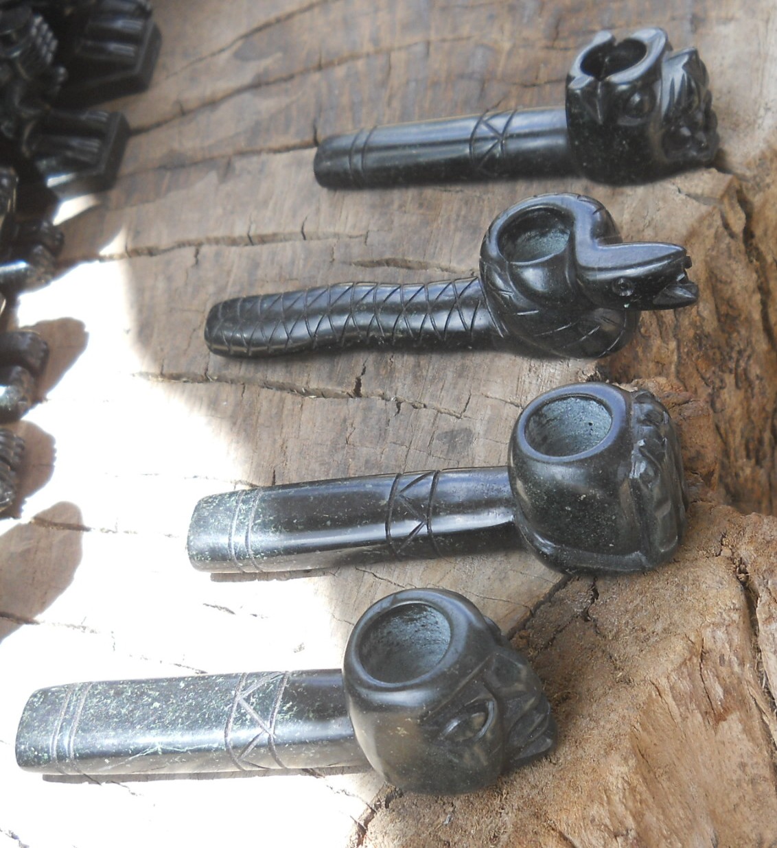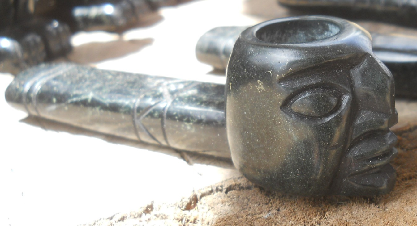 Taller en Cusco Sacsayhuamán, pipa negra con una cara de