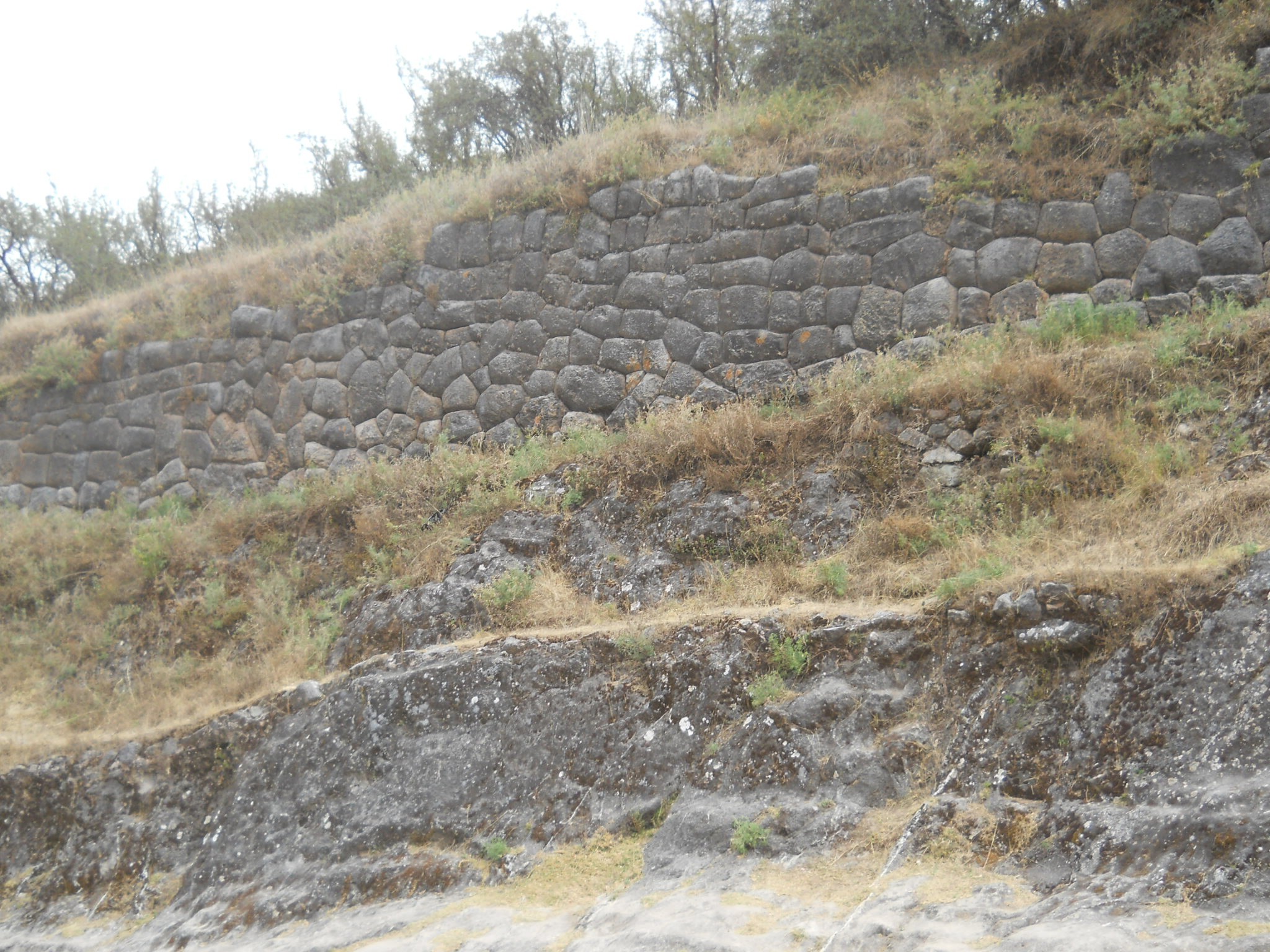 Cusco Sacsayhuamán 16: El camino regreso a Cusco, muro gigante con un diseño de flores 2,3