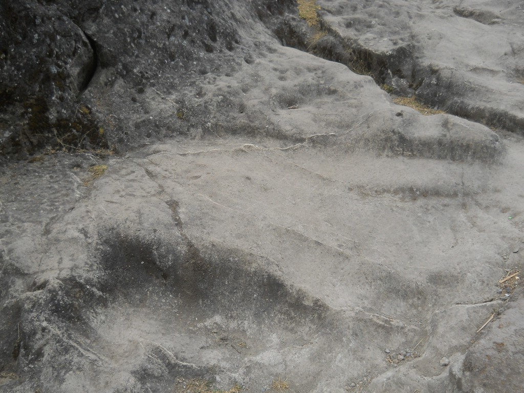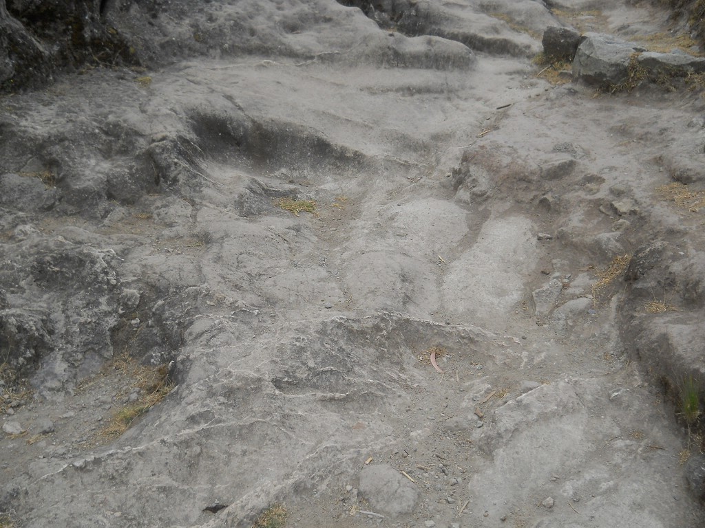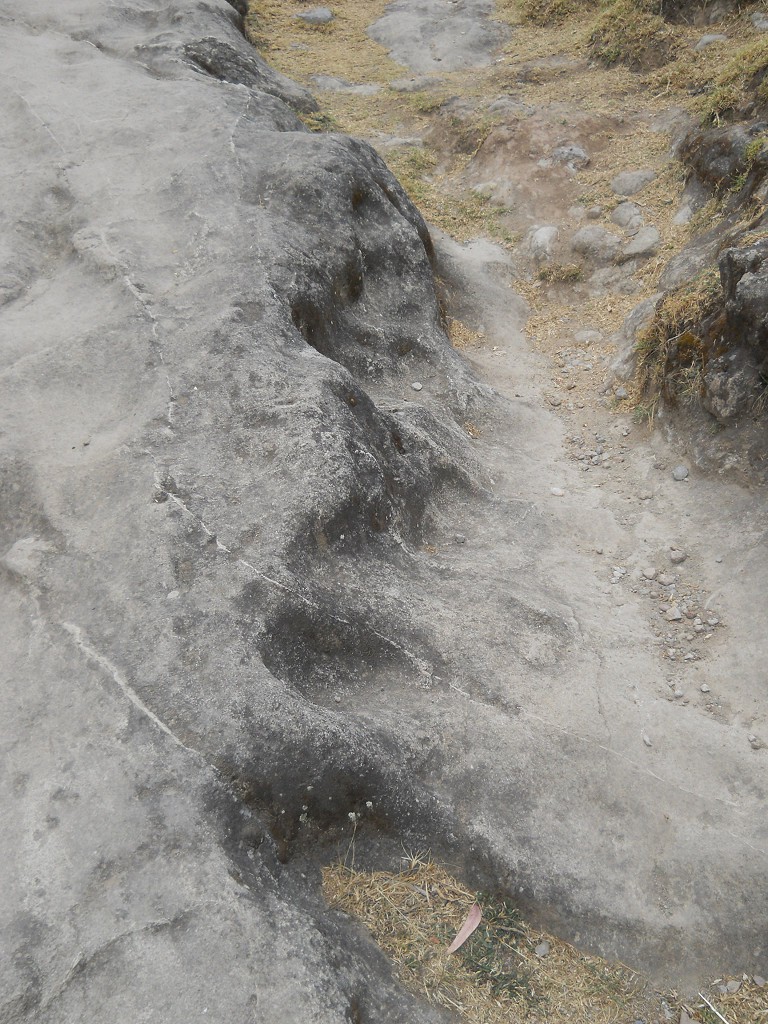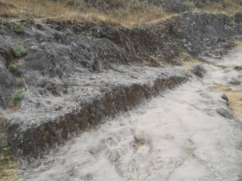Cusco Sacsayhuamán 16: El camino regreso a Cusco, colina con piedra cortada con canalitos y con huecos - detalle 04