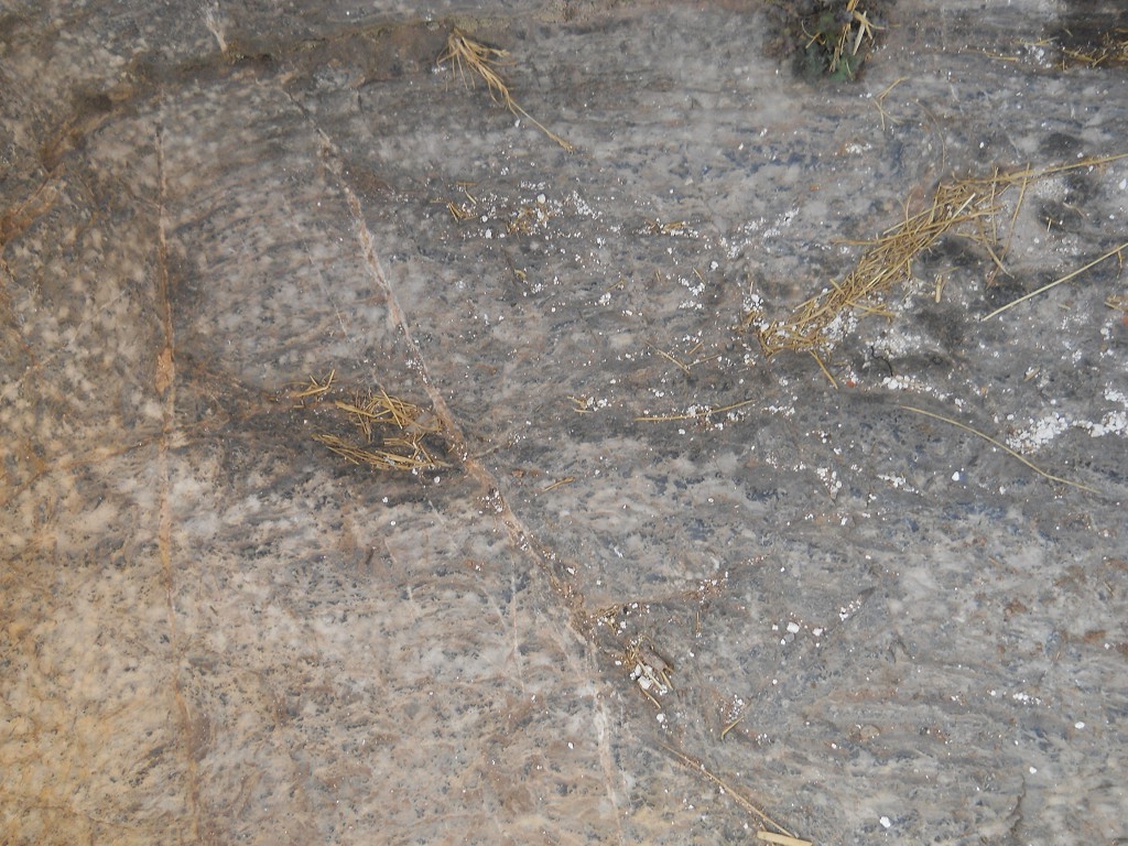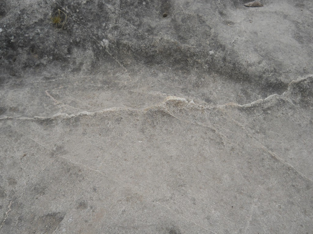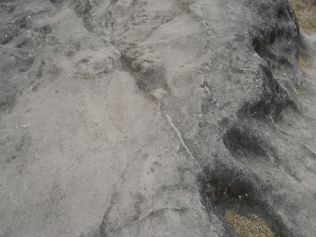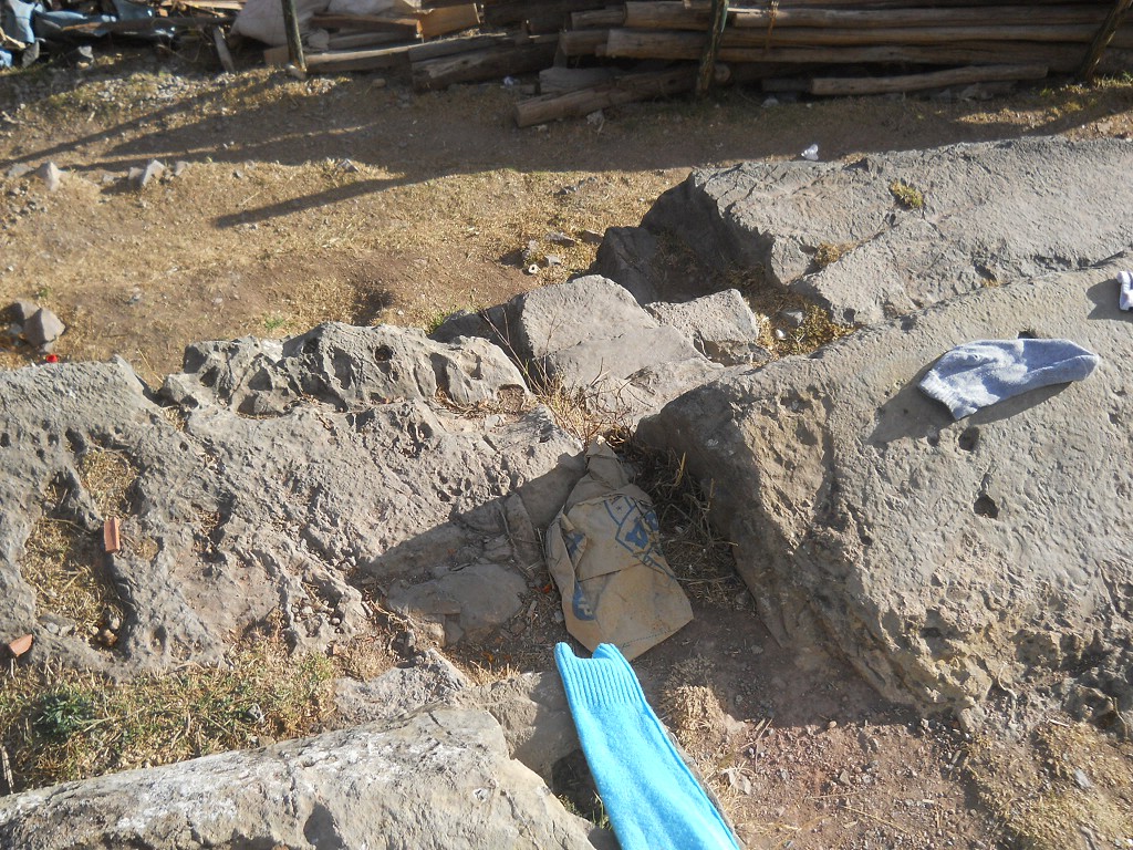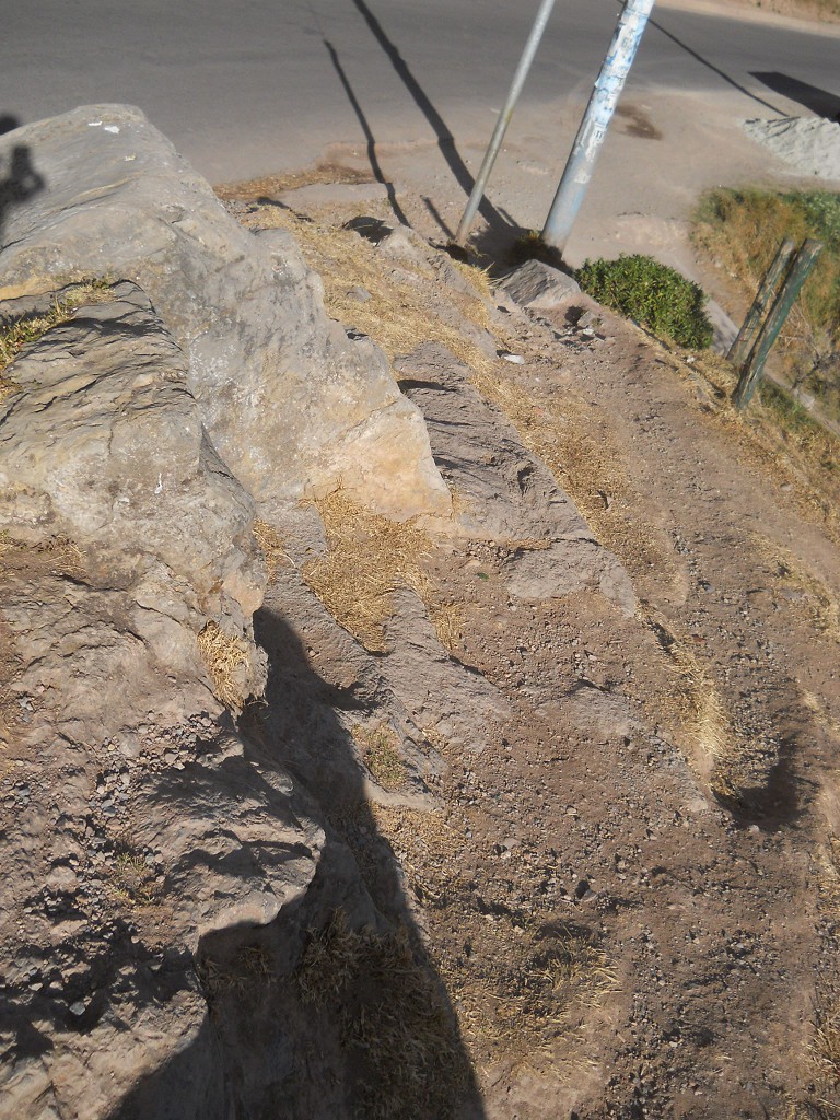 Cusco Sacsayhuamán 16: El camino regreso a Cusco, colina con piedra cortada con canalitos y con huecos - detalle 04