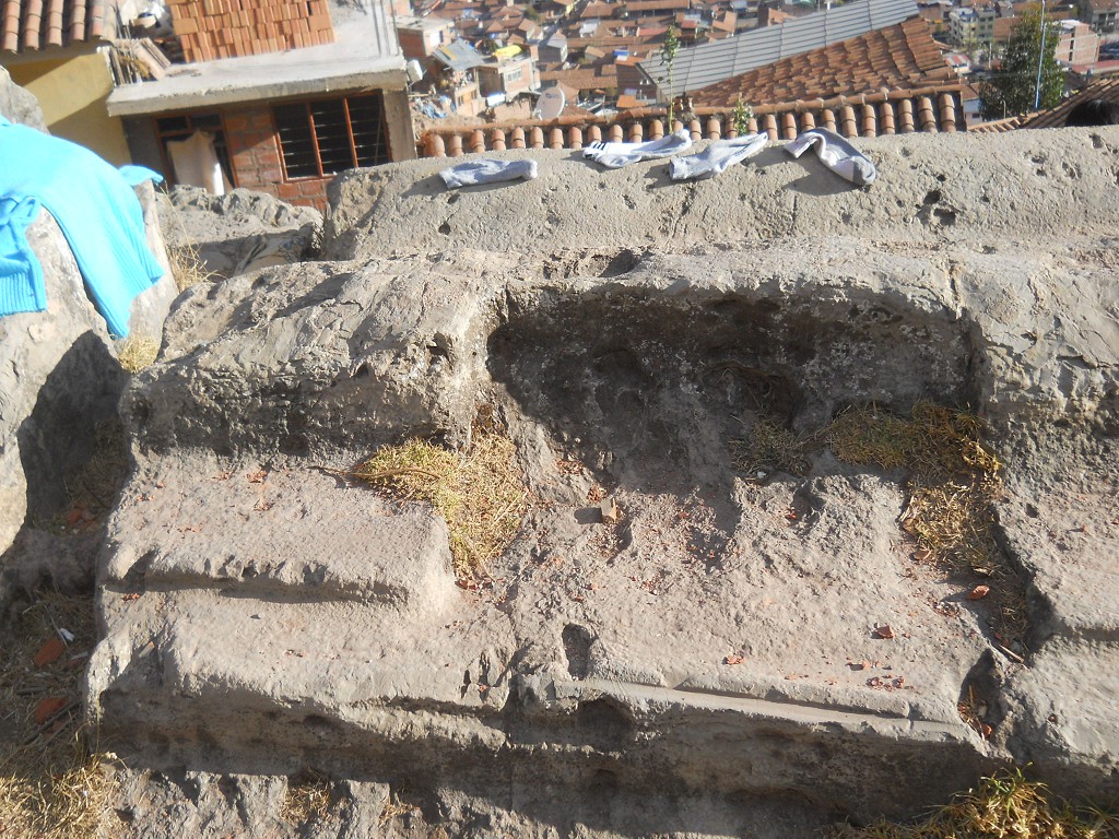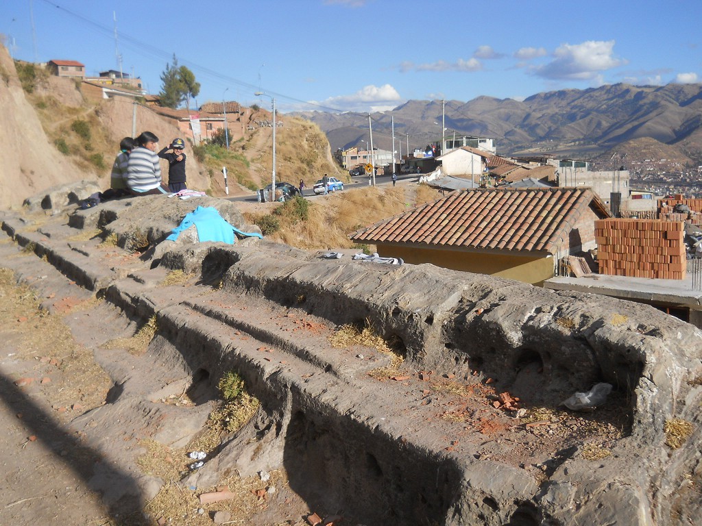 Cusco Sacsayhuamán 16: El camino regreso a Cusco, banco grande con huecos 1,2 - banco grande con medias