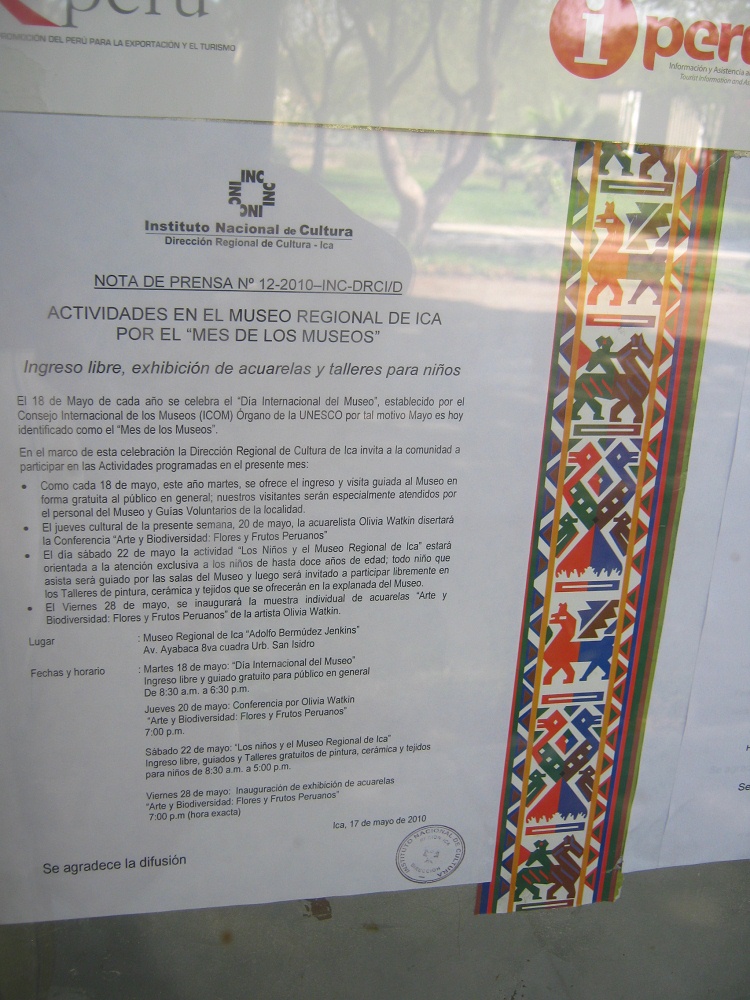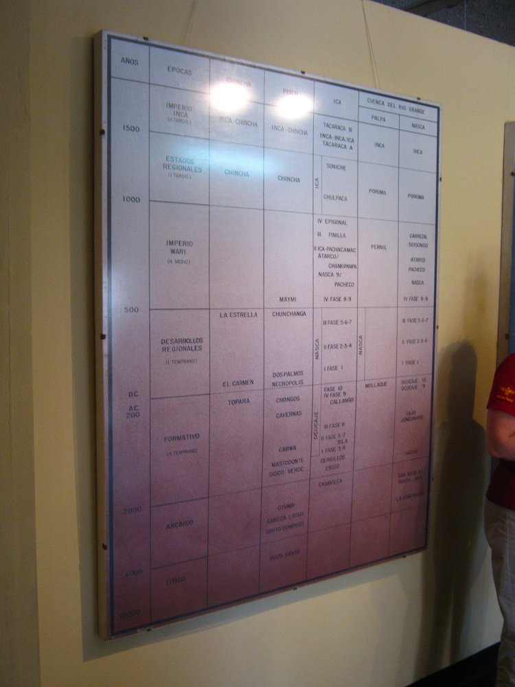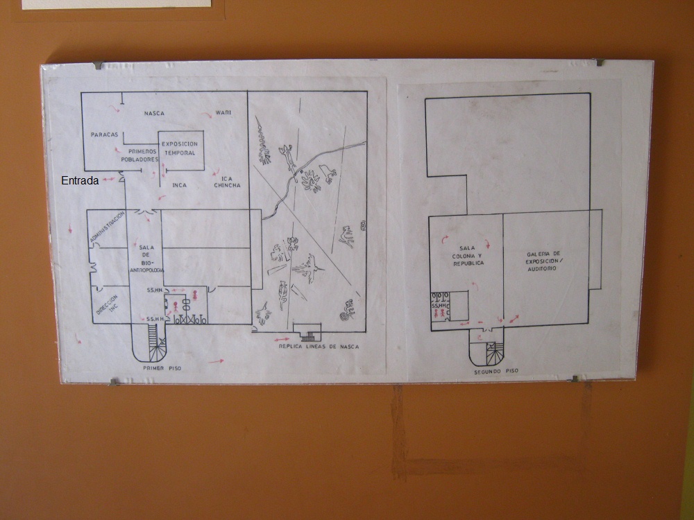 Der Museumsplan Der Rundgang geht vom Eingang (entrada) zur Steinzeit (primeros pobladores), und dann folgen nacheinander die Kulturen Paracas, Nasca, Wari (Huari), Ica-Chincha und Inka. Ausserdem ist ein kleiner Saal der Anthropologie (mit Schädeln und Frisuren), nebendran eine Nachbildung der Linienzeichnungen von Nasca, und im zweiten Stock ein grosser Saal mit Kolonialsachen und mit der Gründung der Republik sowie ein Saal mit Sonderausstellungen bzw. ein Konzertsaal. Ich begnügte mich im Jahre 2010 mit dem Rundgang von der Steinzeit bis zu den Inka, samt Schädeln und Frisuren. |