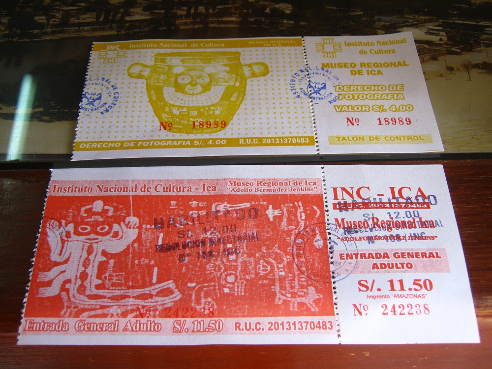 Die Eintrittskarten Die untere Eintrittskarte ist der Eintritt, der 11,50 Soles betrug, plus die Fotografierbewilligung oben in Gelb für 4 Soles. |