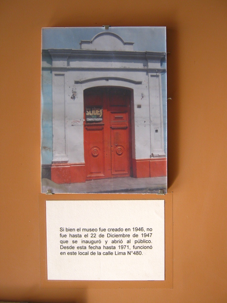 (original Spanisch: Si bien el museo fue creado en 1946, no fue hasta el 22 de Diciembre de 1947 que se inauguró y abrió al público. Desde esta fecha hasta 1971, funcionó en este local de la calle Lima Nº 480). |