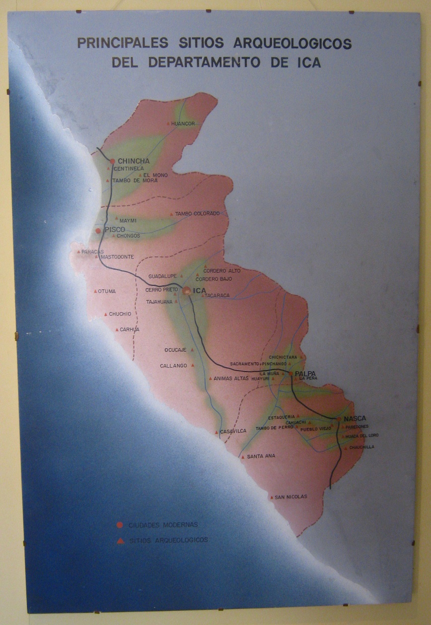 archäologischen Ausgrabungsstätten Grosse, archäologische Stätten in der Region Chincha sind: Huancor, Centinela, El Mono, und Tambo de Mora. Grosse, archäologische Stätten in der Region Pisco sind: Tambo Colorado, Maymi, Chongos, Paracas, Mastodonte, Otuma, Chuchio und Carhua. Grosse, archäologische Stätten in der Region Ica sind: Cordero Alto, Cordero Bajo, Guadalupe, Cerro Prieto, Tajahuana und Tacaraca. Grosse, archäologische Stätten zwischen Ica und Palpa sind: Ocucaje, Callango und Animas Altas. Grosse, archäologische Stätten in der Region Palpa sind: Sacramento Pinchango, Chichictana, La Muña, Huayuri und La Peña, sowie an der Küste Casavilca. Grosse, archäologische Stätten in der Region Nasca sind: Pueblo Viejo, Cahuachi, Estaquería, Tambo de Perro, Paredones, Huaca del Loro, Chauchilla, und an der Küste Santa Ana sowie San Nicolas. |