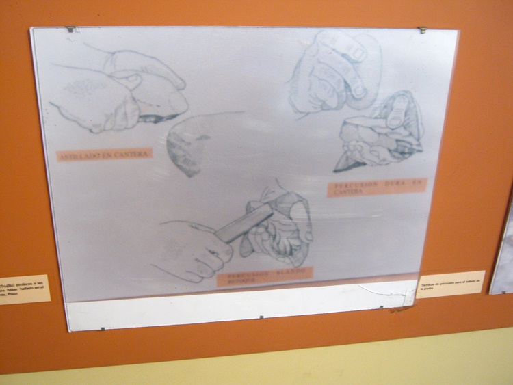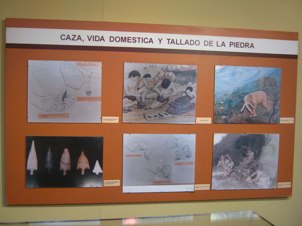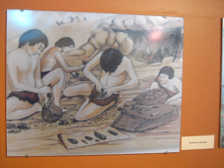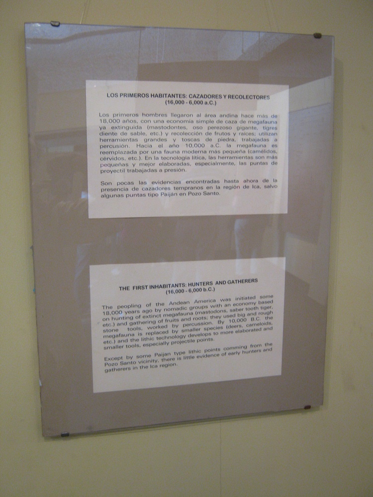 Die ersten Menschen kamen vor über 18.000 Jahren in die Andengegend, mit einer einfachen Wirtschaft mit Jagd auf die grosse Tierwelt, die bald ausgerottet war: Mastodonten [elefantenähnliche Rüsseltiere], Riesenvögel, Reisszahntiger [Smilodon] etc. Diese Leute sammelten auch Früchte und Wurzeln, bauten sich grosse Werkzeuge und grob gehauene Steine, die durch Schlagtechnik bearbeitet waren. Gegen das Jahr 10.000 v.Chr. wurde die Megafauna-Tierwelt durch eine moderne, kleinere Tierwelt ersetzt (Kamel, hirschähnliche Tiere etc.). Während des Litikums wurden dann die Werkzeuge kleiner und besser bearbeitet, speziell die Pfeilspitzen, die mit Drucktechnik gearbeitet waren. Bis heute gibt es von dieser Zeit der frühen Jäger in der Region Ica nur wenige Funde, ausser einige Pfeilspitzen vom Typ Paiján am Ort Heiliger Brunnen (Pozo Santo).> (orig. Spanisch: Los primeros habitantes: cazadores y recolectores (16,000 - 6,000 a.C.) Los primeros hombres llegaron al área andina hace más de 18,000 años, con una economía simple de caza de megafauna ya extinguida (mastodontes, oso perezoso gigante, tigres diente de sable, etc.) y recolección de frutos y raíces; utilizan herramientas grandes y toscas de piedra, trabajadas a percusión. Hacia el año 10,000 a.C. la megafauna es reemplazada por una fauna moderna más pequeña (camélidos, cérvidos, etc.). En la tecnología lítica, las herramientas son más pequeñas y mejor elaboradas, especialmente, las puntas de proyectil trabajadas a presión. Son pocas las evidencias encontradas hasta ahora de la presencia de cazadores tempranos en la región de Ica, salvo algunas puntas tipo Paiján en Pozo Santo.) |