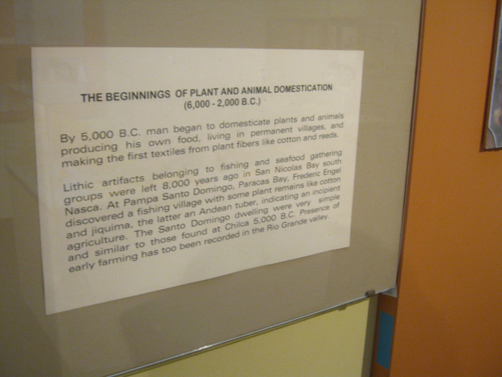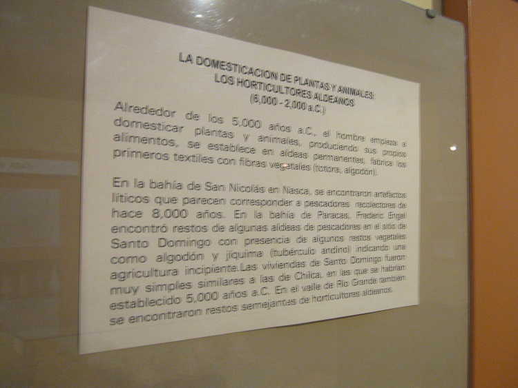 und Sammler mit Landwirtschaft Übersetzung: Die Züchtung von Pflanzen und die Zähmung von Tieren: die ländlichen Bauern (6000-2000 v.Chr.) Um 5000 v.Chr. begann der Mensch, Pflanzen zu züchten und Tiere zu zähmen, und wurde fähig, sich seine eigenen Lebensmittel zu züchten. Es bildeten sich die ersten ständigen Siedlungen, und auch die ersten Kleider wurden produziert, zuerst mit Pflanzenfasern (Binsen, Baumwolle). In der Bucht von Sankt Niklaus (San Nicolás) in Nasca wurden Funde aus dem Litikum gefunden, die scheinbar mit Fischern und Sammlern in Verbindung stehen, die dort seit 8000 Jahren lebten. In der Bucht von Paracas fand [der Archäologe] Frederic Engel an der Ausgrabungsstätte Heiliger Sonntag (Santo Domingo) Reste einiger Fischerdörfer, wo auch pflanzliche Reste wie Baumwolle und Jíquima-Gemüse (Anden-Knolle) gefunden wurden, was auf eine beginnende Landwirtschaft zu dieser Zeit schliessen lässt. Die Wohnungen in Heiliger Sonntag (Ausgrabungsstätte Santo Domingo) waren sehr einfach und ähnlich denen von Chilca, die 5000 v.Chr. gebaut wurden. Im Tal des Grossen Flusses (Rio Grande) wurden ebenfalls ähnliche Reste landwirtschaftlicher Siedlungen gefunden.> (orig. Spanisch: La domesticación de plantas y animales: los horticultores aldeanos (6,000-2,000 a.C.) Alrededor de los 5,000 años a.C., el hombre empieza a domesticar plantas y animales, produciendo sus propios alimentos, se establece en aldeas permanentes, fabrica los primeros textiles con fibras vegetales (totora, algodón). En la bahía de San Nicolás en Nasca, se encontraron artefactos líticos que parecen corresponder a pescadores recolectores de hace 8,000 años. En la bahía de Paracas, [el arqueólogo] Frederic Engel [Federico Ángel] encontró restos de algunas aldeas de pescadores en el sitio de Santo Domingo con presencia de algunos restos vegetales como algodón y jíquima (tubérculo andino) indicando una agricultura incipiente. Las viviendas de Santo Domingo fueron muy simples similares a las de Chilca, en las que se habrían establecido 5,000 años a.C. En el valle de Río Grande también se encontraron restos semejantes de horticultores aldeanos.> |