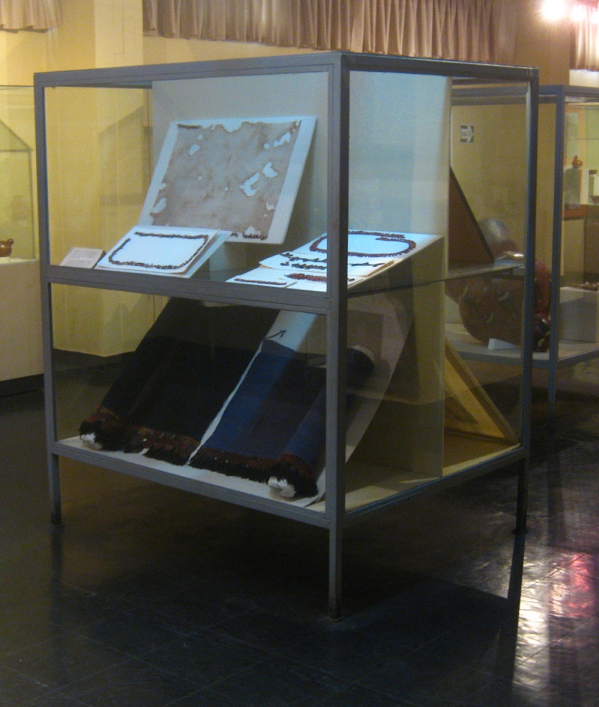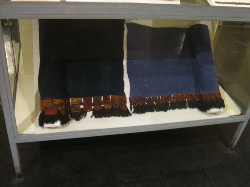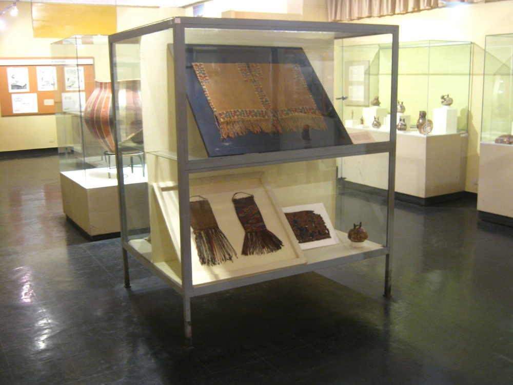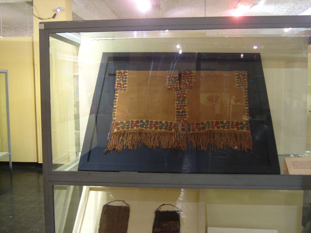 Rückseite der Vitrine mit Geweben der Nasca-Kultur