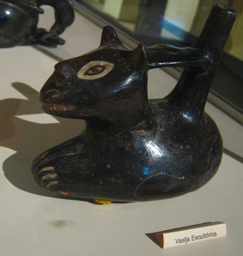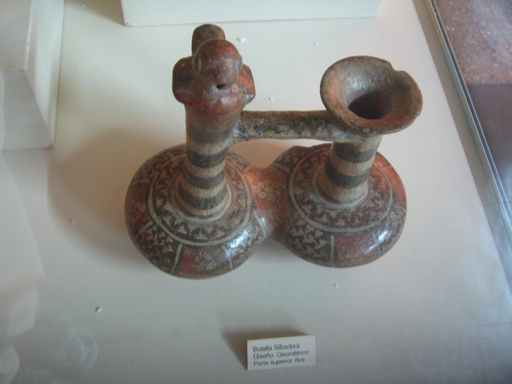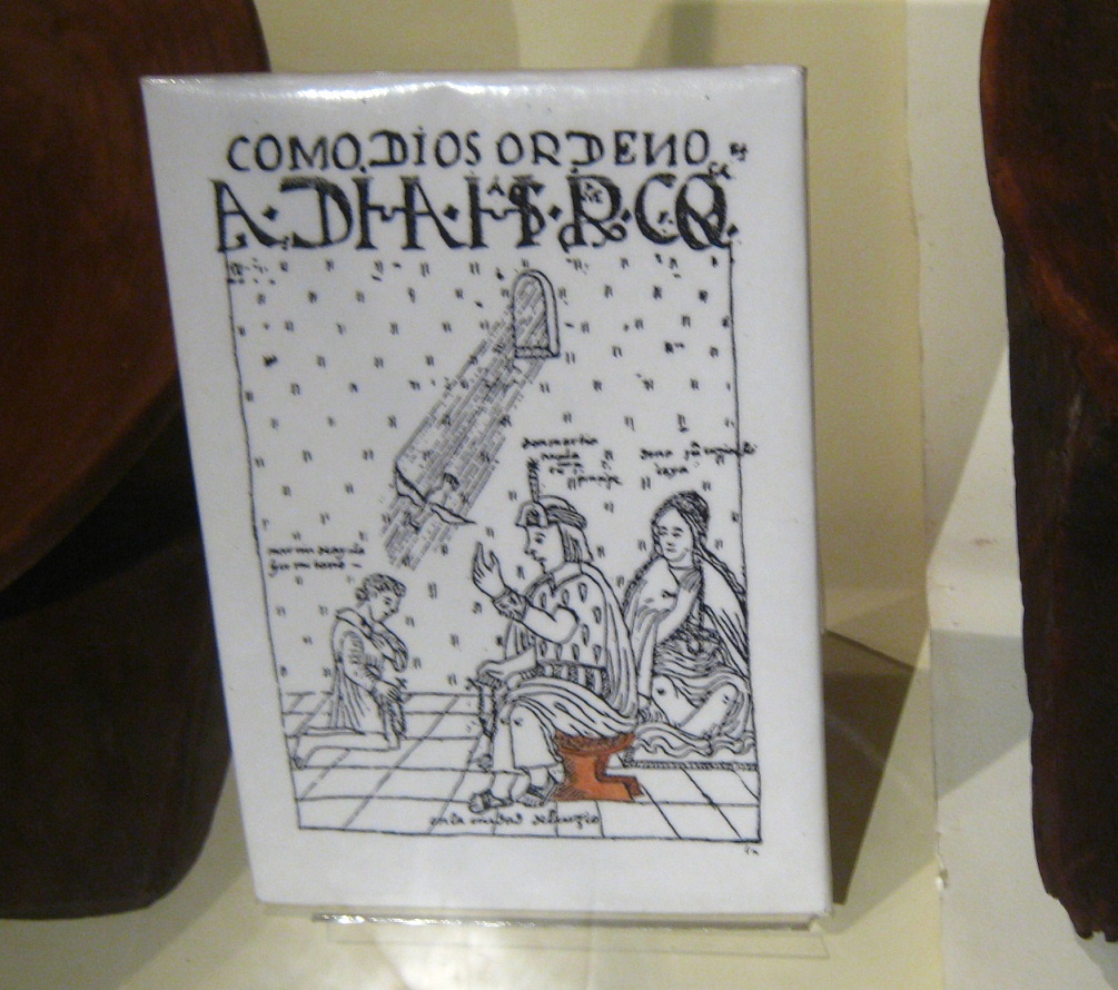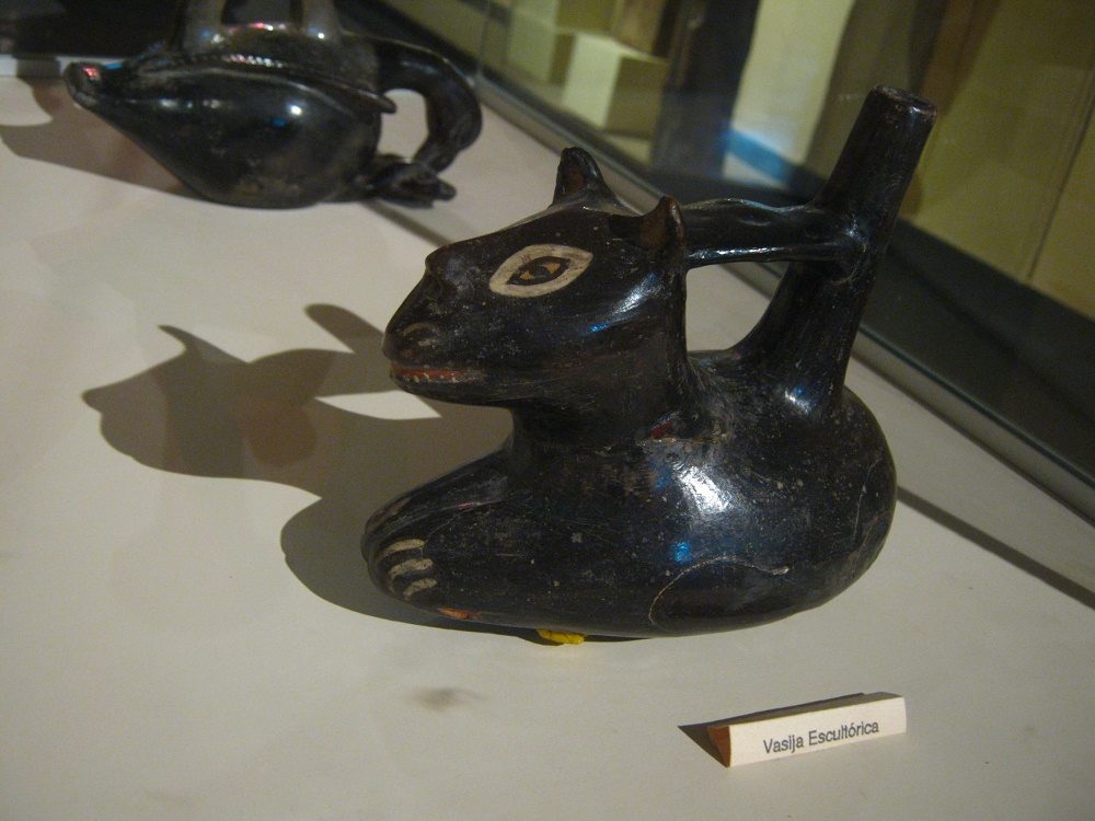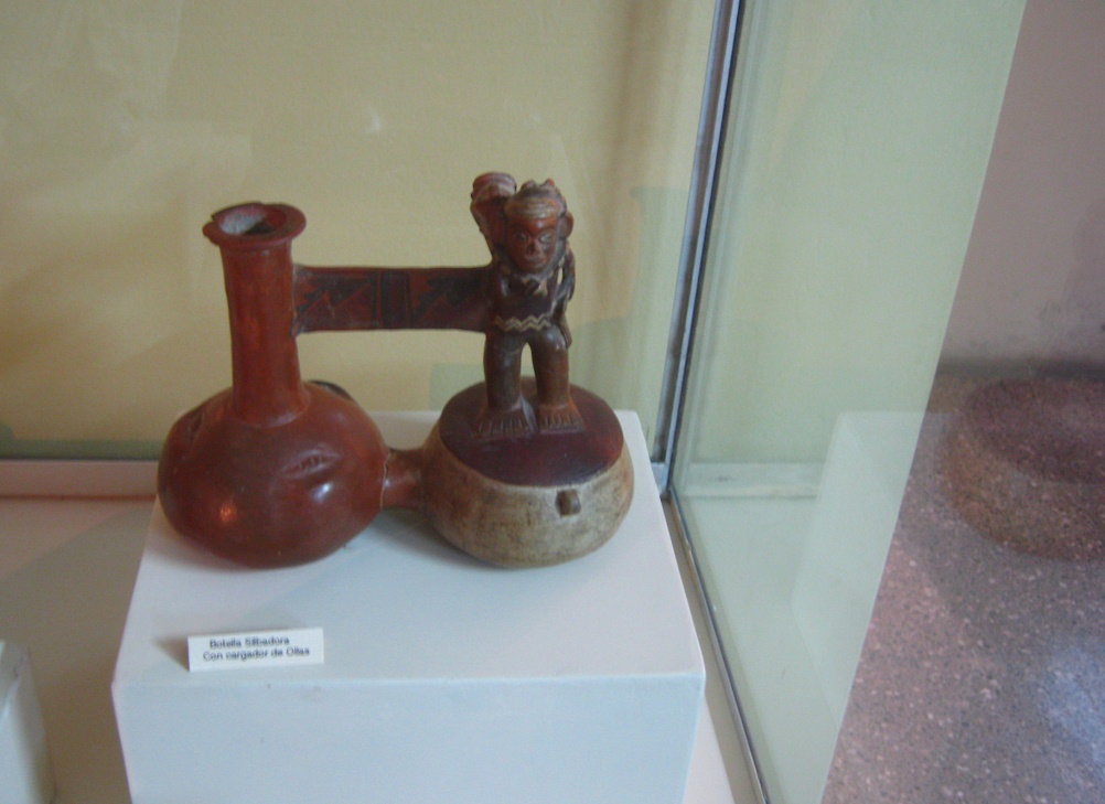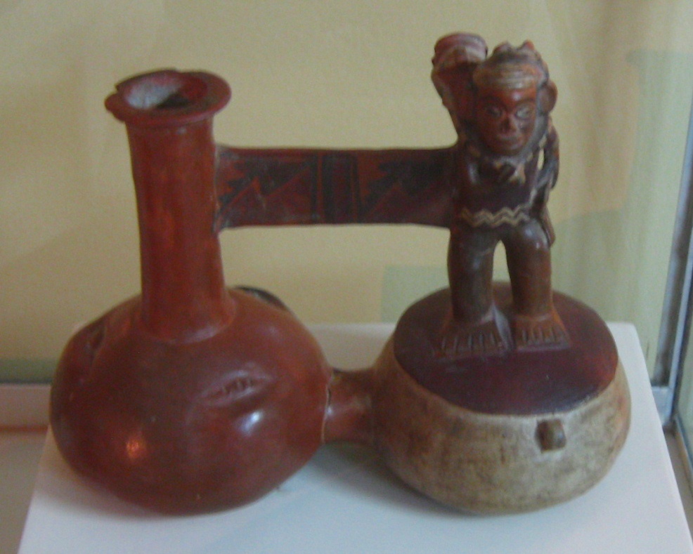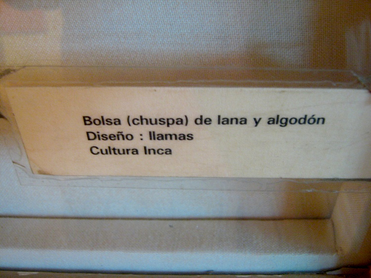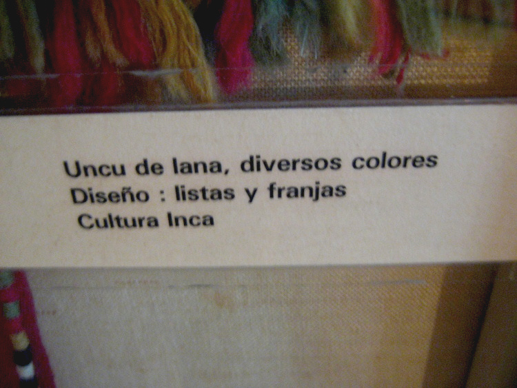 Der verzierte Sitz weist geometrische Muster auf, in rot gemalt. Die Herkunft ist unbekannt. Der Ureinwohner-Chronist Guamán Poma de Ayala (1615) hat den Gebrauch dieser Sitze in drei seiner Abbildungen dargestellt, auch nach der spanisch-kolonialen Besetzung.> (original Spanisch: Dos sillas talladas en madera de pacae. Fueron halladas por el investigador Alejandro Pezzia (1968) al interio de una tumba profanada, ("asociadas a 2 aríbalos Inca"), en Callango, valle bajo de Ica. La silla decorada con diseños geométricos con pintura roja no tiene procedencia conocida. El cronista indígena Guamán Poma de Ayala (1615) ilustra el uso de éstas en 3 de sus láminas, incluso después de la conquista española). |
