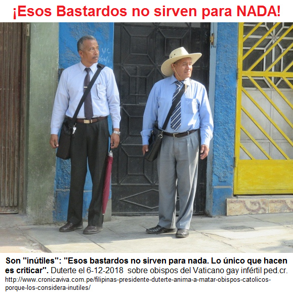 Obispos sonsos psicoterroristas, visto en Lima en Comas jirón Nicaragua el 6-12-2018 - son payasos en ropa de los colonos de banquero jugando con camisas, corbatas, paraguas, sombrero de Texas etc. - Duterte dijo claramente que NO SIRVEN PARA NADA, son BASTARDOS INÚTILES - NO a la iglesia fea del Vaticano gay - la Biblia de fantasía de Asia NO VALE - los obispos con sus abusos infantiles sistemáticos son enfermos