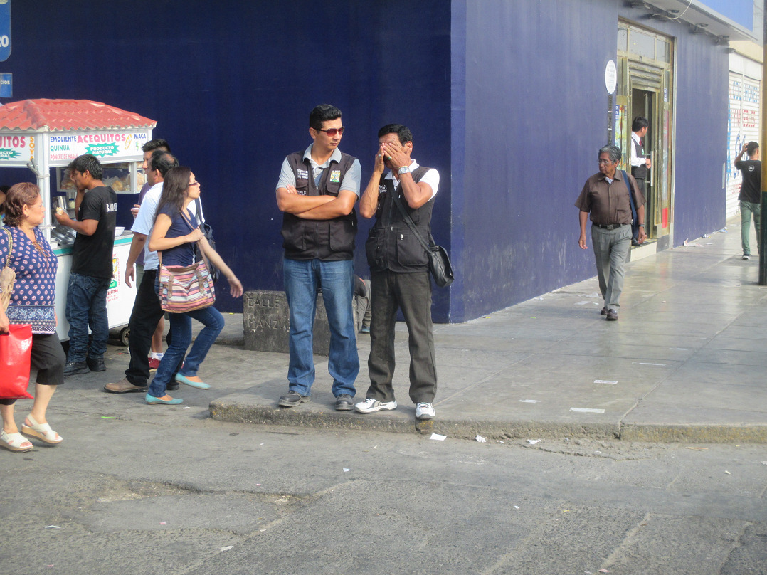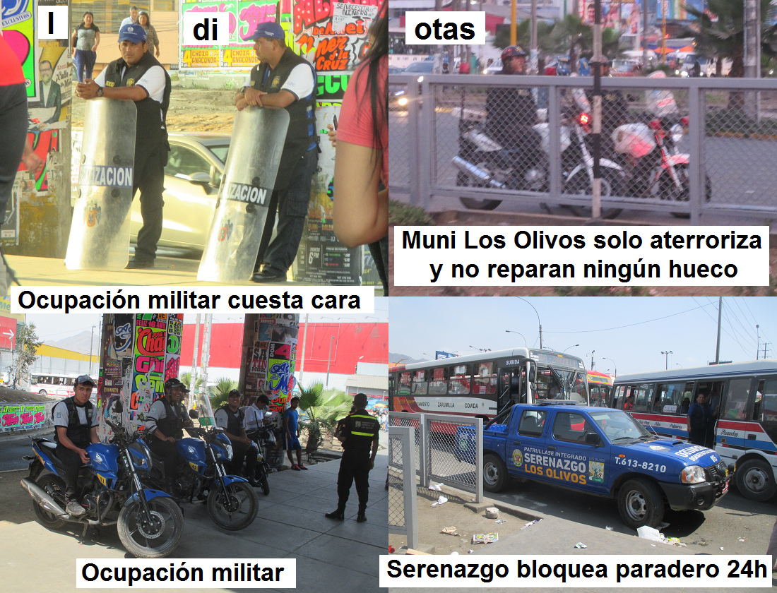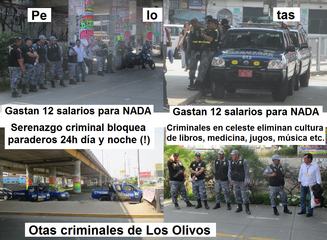 Antes un año y medio en abril 2015 se pudo observar ya con un alcalde capitalista sin saber social - Rosario Ramírez - que él y sus autoridades de SU MUNICIPALIDAD han atacado, cazado y robado ambulantes en el paradero Yanbal sistemáticamente aúnque son bien amados y rinden su servicio a la población de Los Olivos. Ahora desde 2 semanas - desde el fin de noviembre 2016 - sus autoridades provocan una nueva guerra civil con policía y vigilantes con armas y escudos eliminando los ambulantes del cruce de la avenida Izaguirre con la Panamericana. Así también eliminan productos de salud, medicinales y los libros del cruce - y al mismo tiempo gastan miles de soles para salarios de policías y vigilantes de su municipalidad porque cada lado del cruze necesita al menos 4 vigilantes durante 24 horas por día y noche, o aún están como ejércitos completos de apr. 20 hombres armados (!!!). ¿Gastan miles de soles para ese terrorismo lo que no sirve para nada?