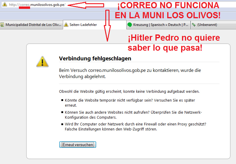 Página web de propaganda de Los Olivos: el correo electrónico no funciona - ¡el Hitler Pedro "Moisés" (¡qué feo nombre judío!) no quiere saber lo que pasa!