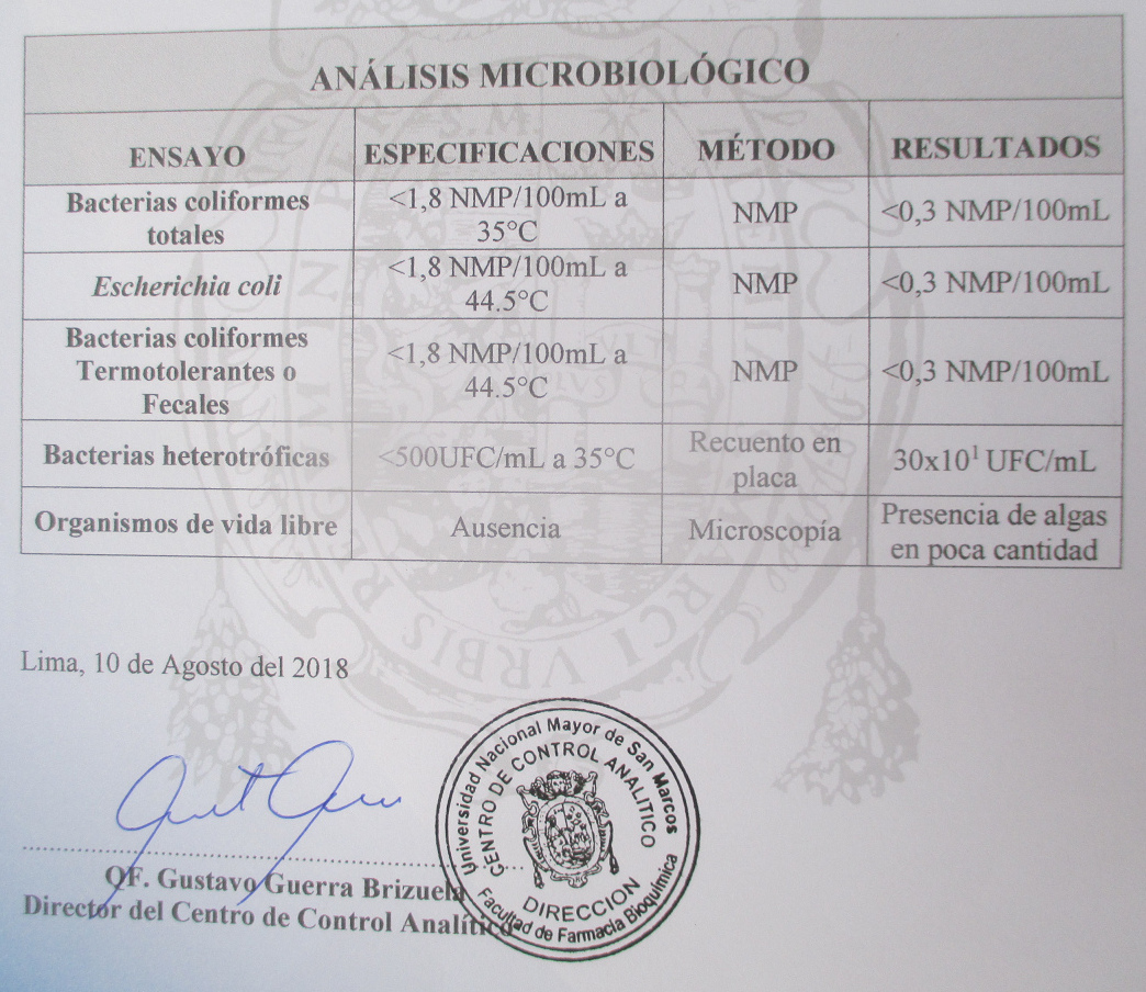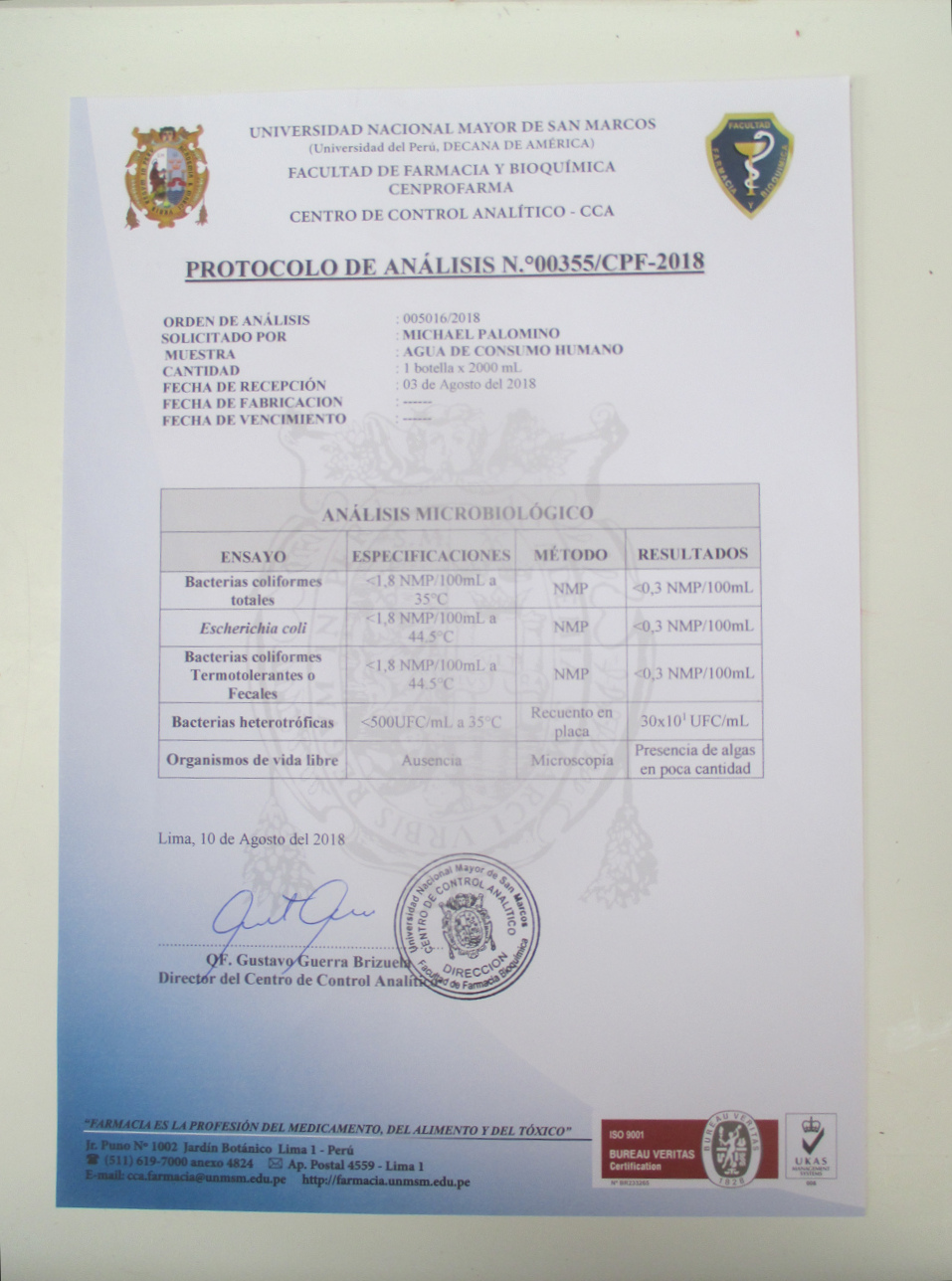 10-08-2018: El resultado del laboratorio de la Universidad San Marcos con el agua solar: preparar agua con la radiación UV del sol sale con buena calidad - SIN HERVIR EL AGUA