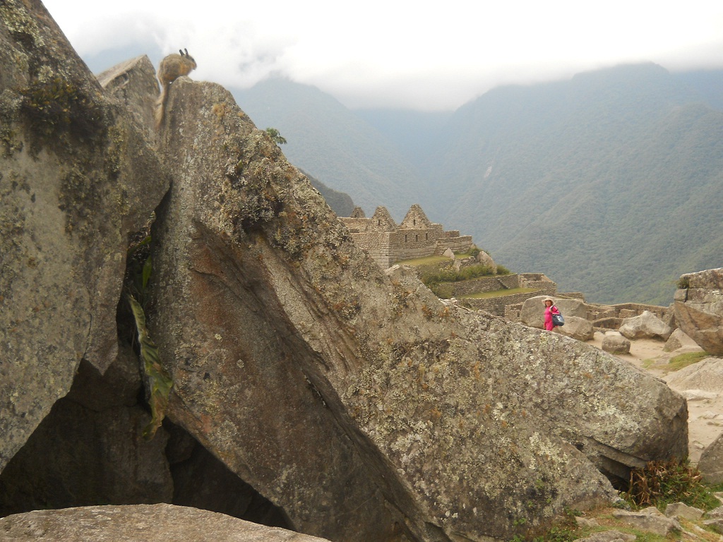 Comadreja en la punta de una piedra cortada en la cantera grande de Machu Picchu - primer plano