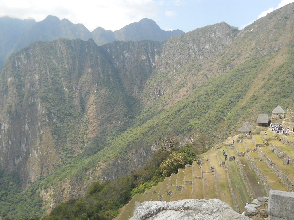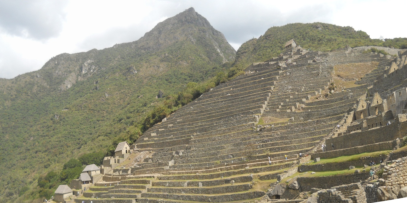 Machu Picchu: view of the big wall and of the section of agriculture in the background with the little house on the top
