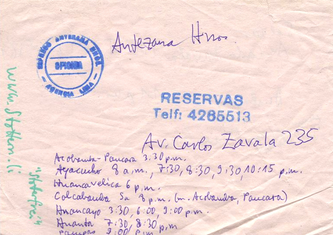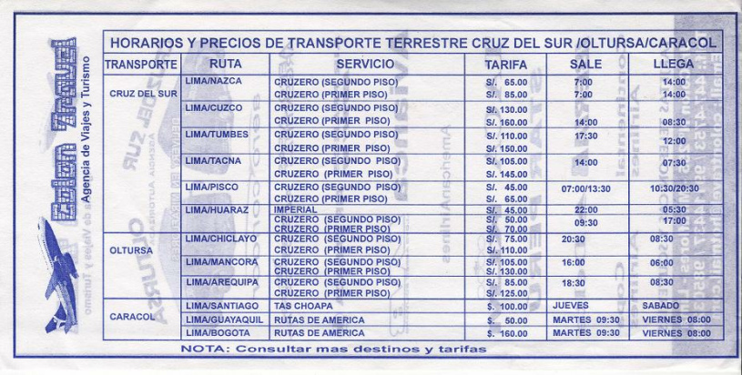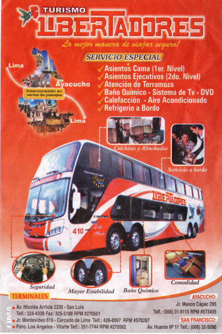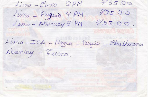 Die Preise der Buslinie für dieselbe Strecke kann sehr unterschiedlich sein. Der Preis für die Strecke von Lima nach Ayacucho kann z.B. 30 Soles oder bis zu über 100 Soles betragen. Die Buslinien treffen mit dem Preis eine Vorauswahl über die Kundschaft. Einen Tag vor der Reise sind in den Bussen meistens noch ca. 3 bis 5 Plätze frei.