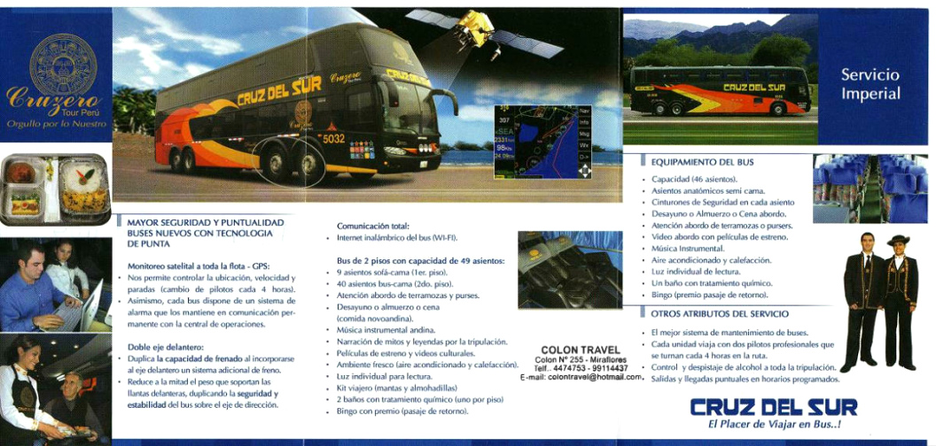 Doppeldeckerbusse sind auf Bergstrecken nicht zu empfehlen (z.B. die Strecke Lima-Ayacucho): Sie schwanken auf Bergstrecken z.T. bedenklich und die Plätze im oberen Geschoss können deswegen sehr viel schneller Erbrechen auslösen als die Plätze im "Parterre". Aus diesem Grund sind die Plätze im oberen "Stockwerk" auch billiger als die Plätze im "Parterre". Doppeldeckerbusse können auf Bergstrecken ausserdem nicht so schnell fahren wie normale Busse, weil eben grosse Schwankungen im oberen "Stockwerk" verhindert werden müssen.