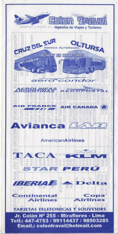 Die Reisebüros für Touristen befinden sich in Lima im Touristenviertel Miraflores. In den anderen Städten sind die Reisebüros für Touristen immer im Zentrum um den Zentralplatz (Plaza de Armas) zu finden.