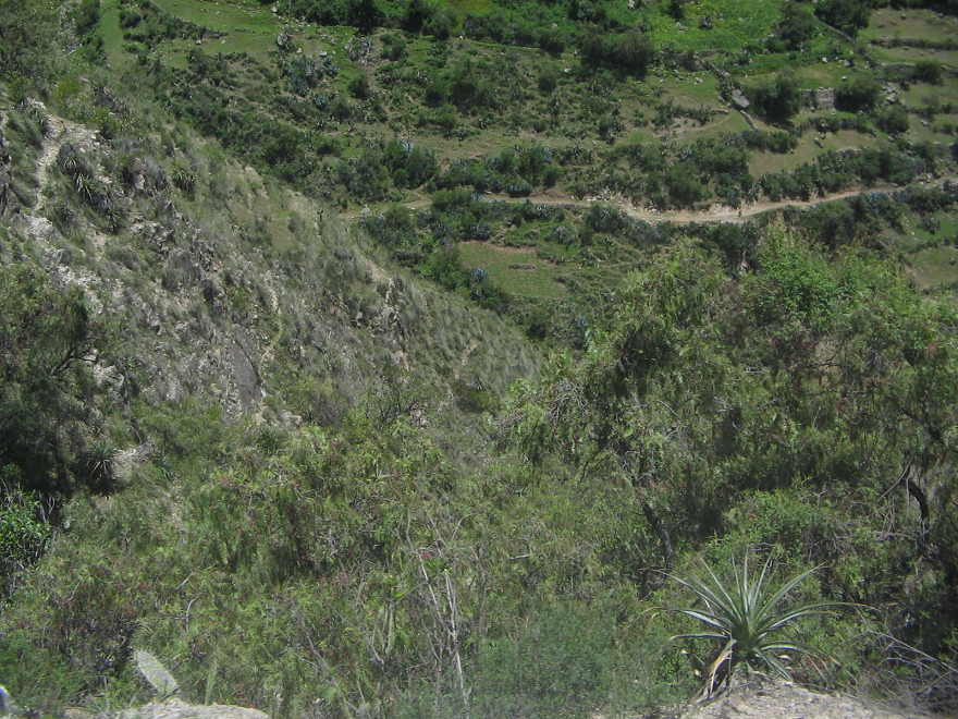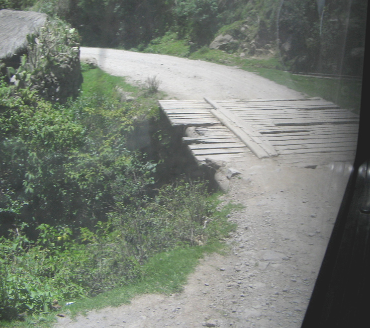 Die Brücke über den Pampas-Fluss zwischen Chumbes und Chincheros liegt auf 1950 m Höhe [2] oder auf 2000 m ü.M. [3]. Wir hatten von 10:50 bis 13:24 Uhr innerhalb von 2 1/2 Stunden über 2000 Höhenmeter auf einem Feldweg zurückgelegt und alle dazugehörigen Klimazonen durchfahren.