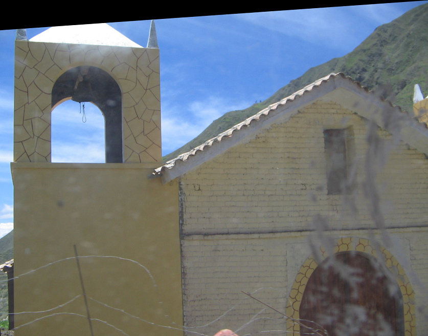 Die Einfahrt in Ocros (Departement Ayacucho) war nicht spektakulär, bis wir plötzlich an der kleinen Kirche vorbeifuhren. Wie man sieht, ist der Kirchturm kaum höher als das Kirchendach, und mehr als eine kleine Glocke ist da nicht. Das ist sympathisch, denn so bleibt das Glockenläuten auf eine niedrige Lautstärke beschränkt.