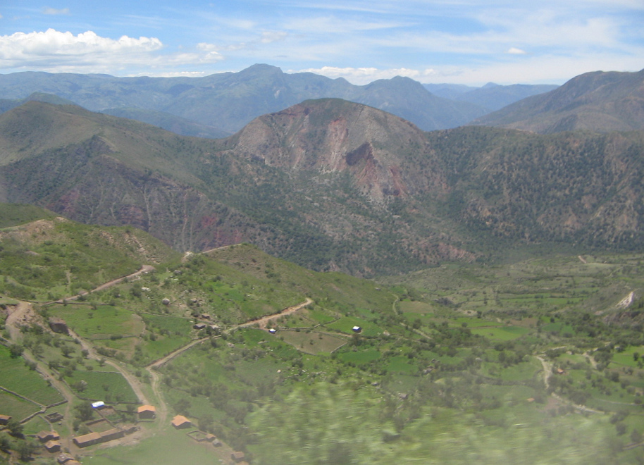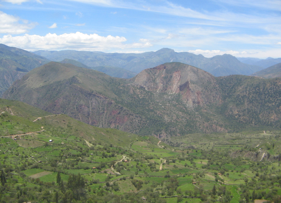 Sicht auf Chumbes und Andenketten mit einem kugelartigen, roten Berg (02)