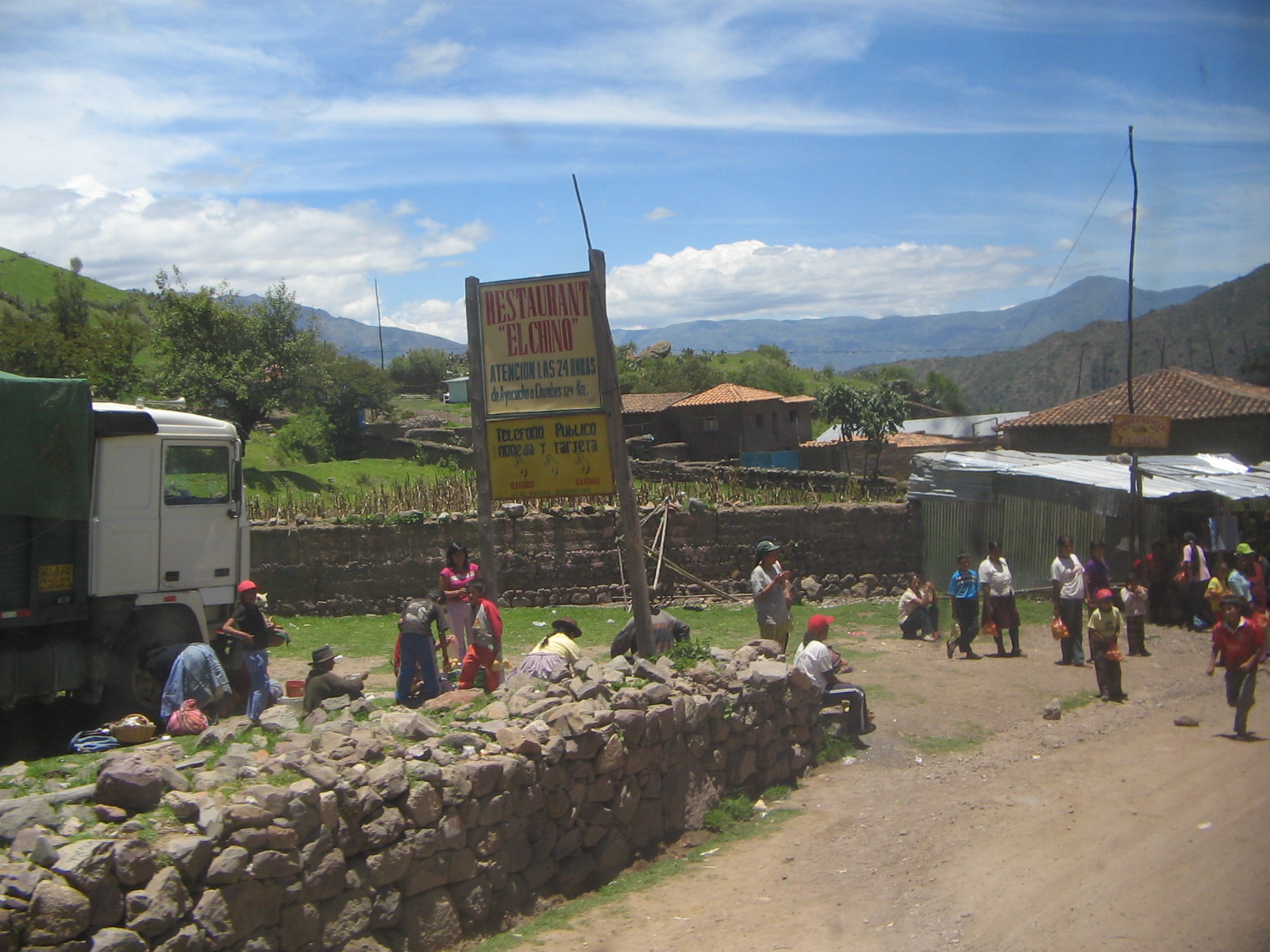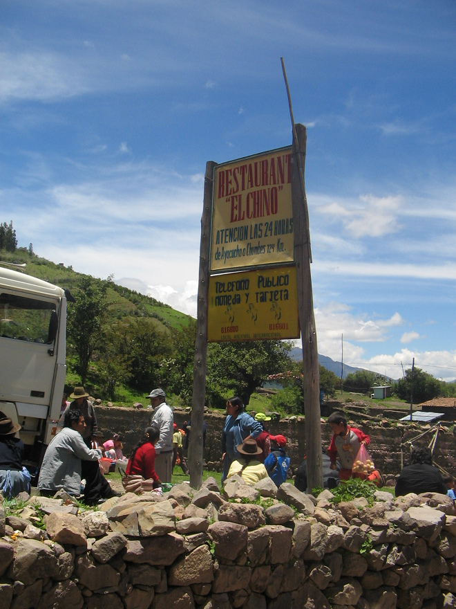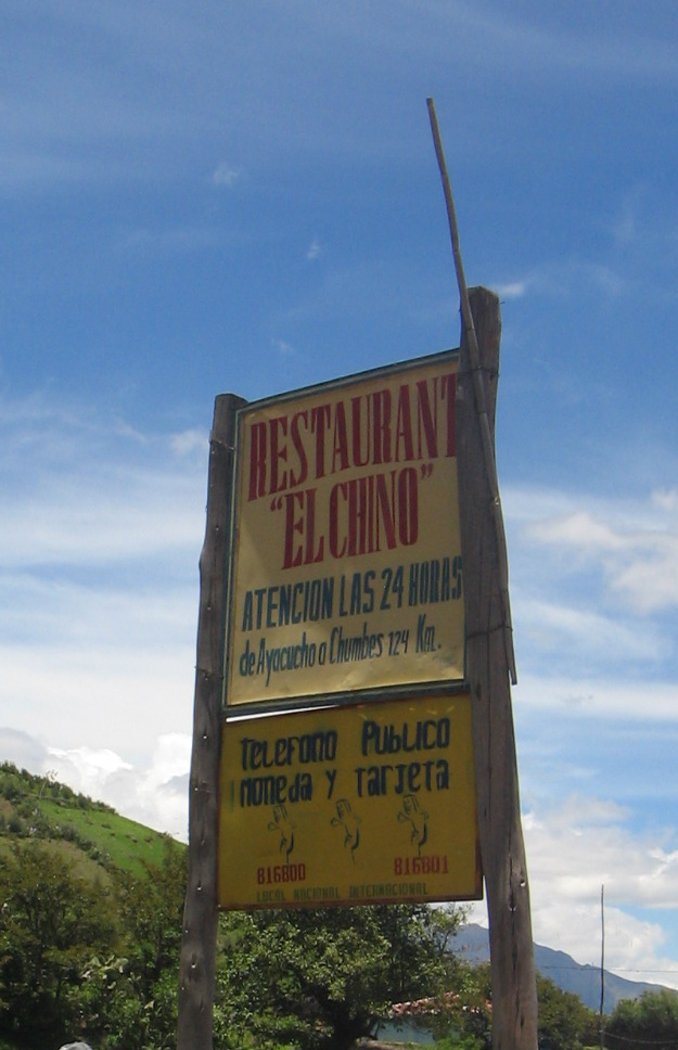 <Restaurant "Zum Chinesen", 24-Stunden-Service, von Ayacucho nach Chumbes 124 km; öffentliches Telefon, mit Münzeinwurf oder mit Karte (816800, 816801), lokal, national, international.>