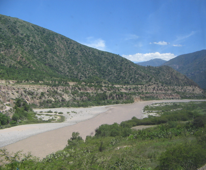 Insgesamt erstreckt sich die Gemeinde Chumbes von Höhenlagen mit Minimaltemperaturen bis zu 2 Grad Celsius bis an den Pampas-Fluss mit Urwald-Klima bis zu 28 Grad Celsius [4]. Also umfasst das Gebiet von Tumbes mehrere Klimazonen. Und zum Fluss im Tal führte uns die Weiterfahrt.