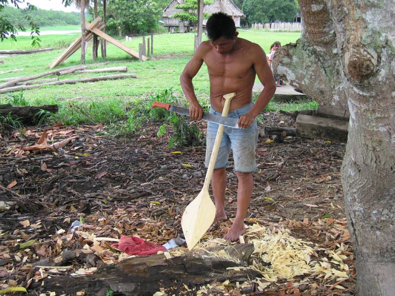 schnitzt mit seiner Machete ein Paddel. |