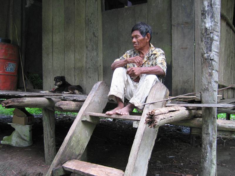 sitzt auf dem Vorplatz seines Pfahlhauses. |
