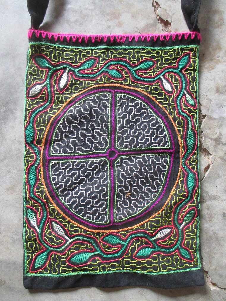 Tasche mit der Shipibo-Welt - die Lebensblume, Nahaufnahme - die Toe-Blume, Nahaufnahme - das Muster der Schildkröte, Nahaufnahme
