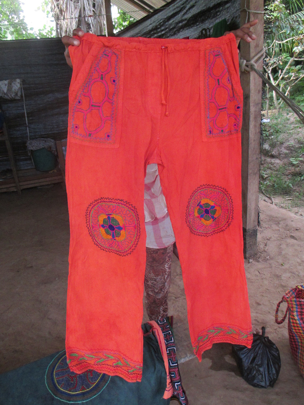 Shipibo-Design: Tasche mit der Shipibo-Welt - die Lebensblume - die Toe-Blume - rote Hose mit Shipibo-Mustern mit Schildkröte und Ayahuasca-Pflanze