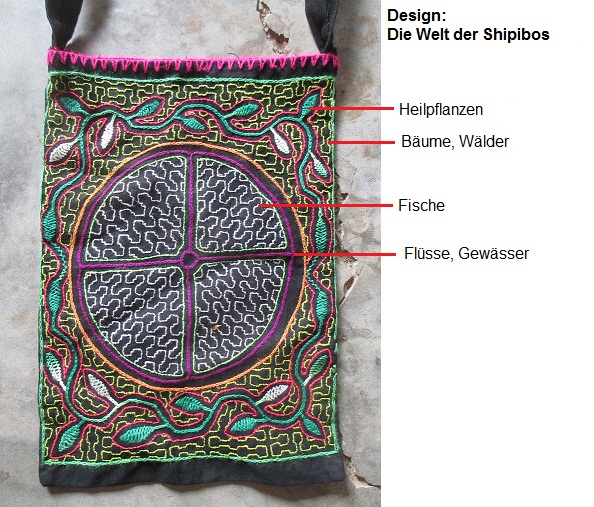 Tasche mit der Shipibo-Welt mit Beschreibung: Heilpflanzen, Bäume, Wälder, Fische, Flüsse und Gewässer